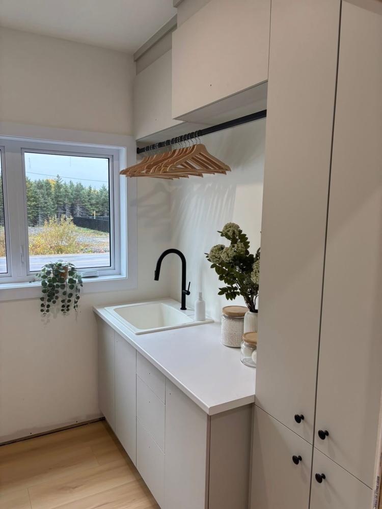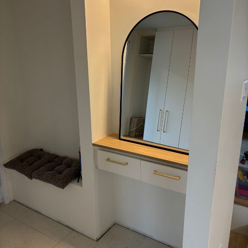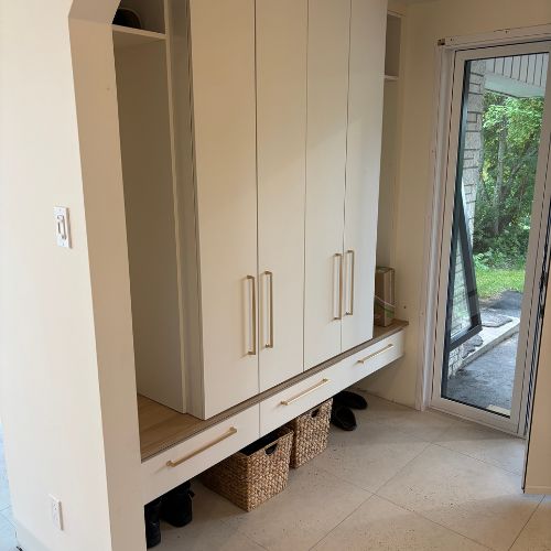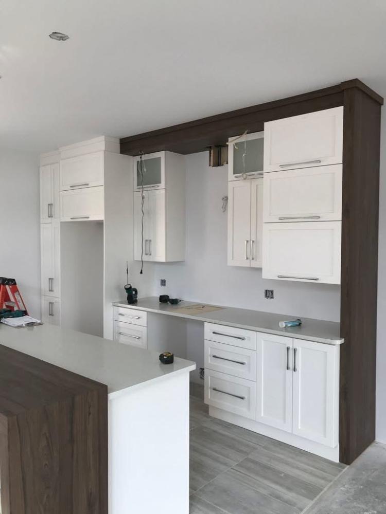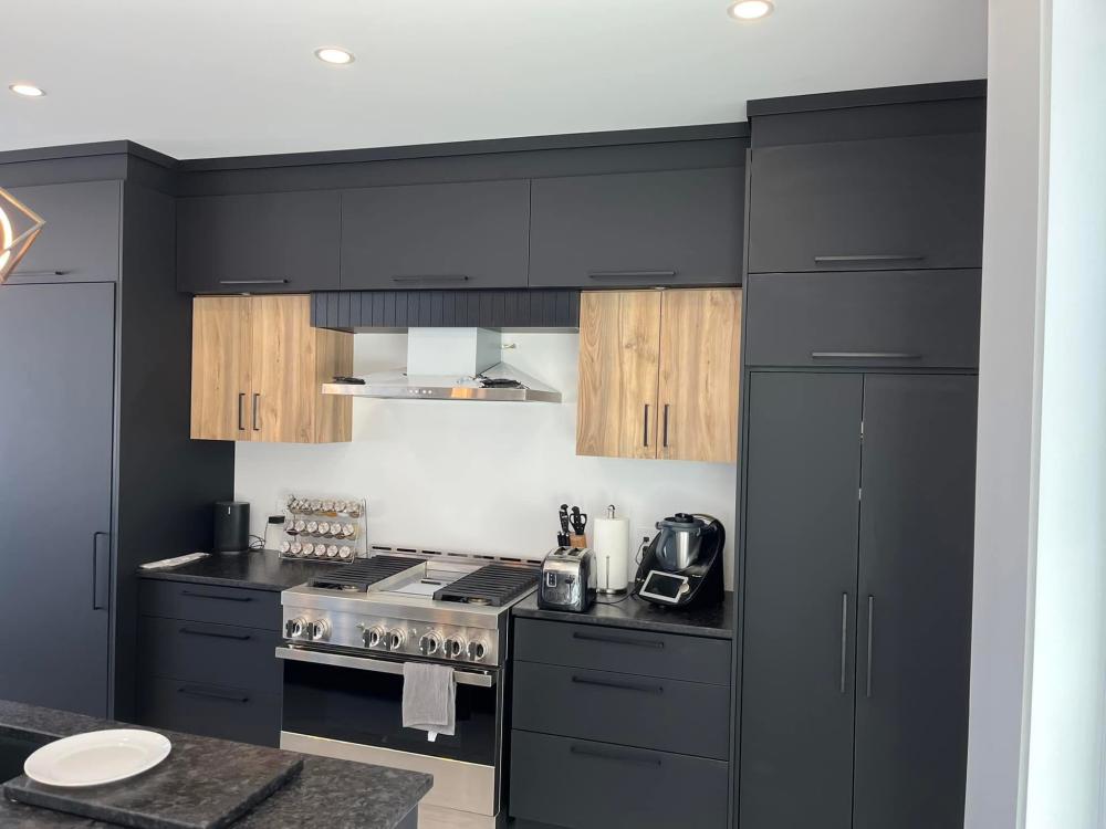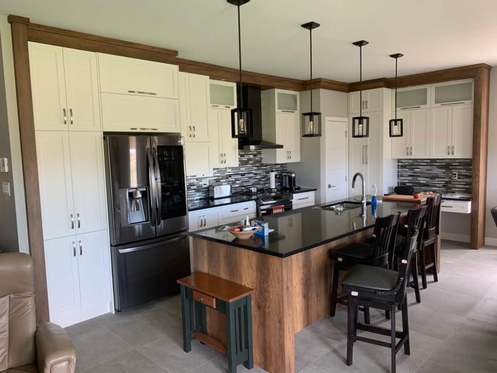 Conception, fabrication et installation complète de vos armoires, îlots, rangements et finitions.