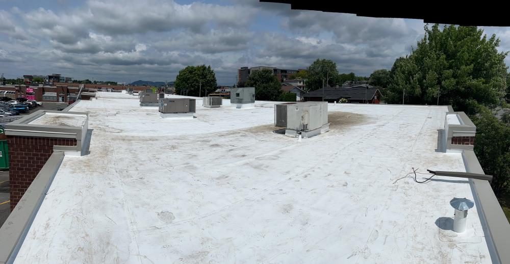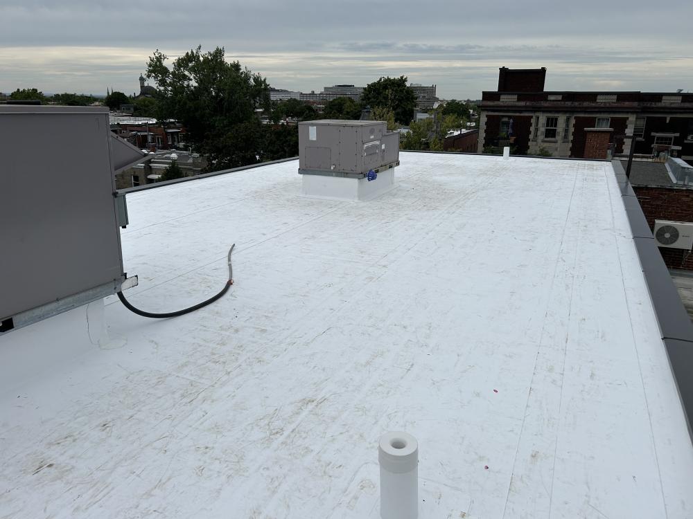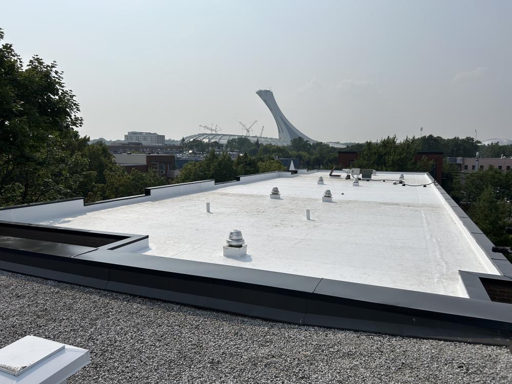 Membrane blanche, Toiture plat, TPO, Firestone , Ferblanterie, Fascia, Soffites, Revêtement métallique, Ventilation, Condensation, Isolation, Puits de lumière, Garantie supérieure