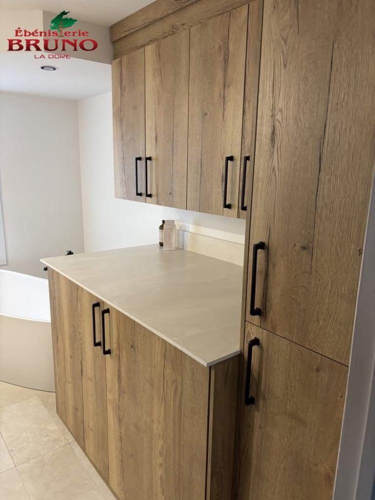 Conception, fabrication et installation complète de vos armoires, îlots, rangements et finitions.